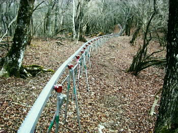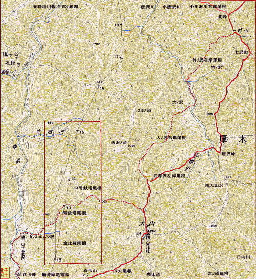 新多摩線は新秦野線(新富士変電所〜新秦野変電所.57基.)から繋がる超高圧の送電線 500KV×2.鉄塔91基を持ち.新秦野変電所と新多摩変電所とが結ばれている。 秦野駅近くの新秦野変電所からヤビツ峠を越え大山北尾根の西側の各支尾根を支えに唐沢沿いに北上し宮ヶ瀬湖.津久井湖を跨ぐ。 更に景信山東肩から新多摩変電所に抜ける総延長39.9kmの送電線 今回初めて大山に入山した。その流れから宮ヶ瀬湖に至るまで周辺の山々を2ヶ月間掛け4度歩むことになる。 そして送電線との係り合いも深く持つようになった。 16号鉄塔の尾根は北尾根913mPから地獄谷出合間の破線道 14号鉄塔尾根は初め北尾根を下って登り返し.石尊沢左岸尾根を下る予定でいた。 13月鉄塔尾根は今年の2/17日に入山した破線ルート 13号・14号鉄塔 12〜15号鉄塔間は国土地理院地形図によると内左の送電線黒線で記載されているが.本来は右の破線上を敷線されていると思われる。 13号鉄塔は実際13号鉄塔尾根を登ってみると北側に派生した尾根に建てられていた。 800m付近に記載されているが誤記で.100m程上の破線上900m付近に建てられていた。 破線が送電線の位置。又14号鉄塔も更に尾根上.890m付近あり。12〜13号鉄塔間の尾根は金比羅尾根になる。