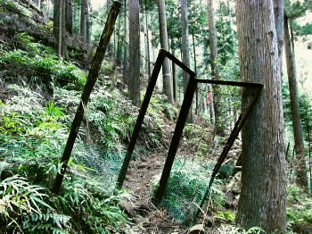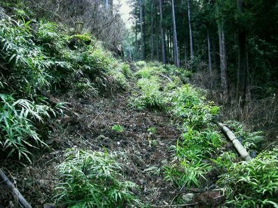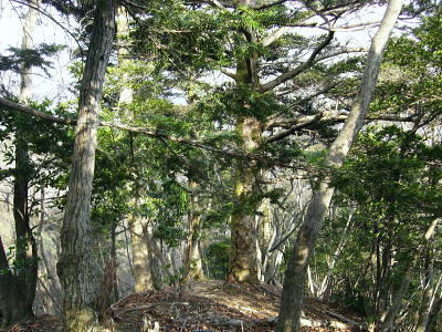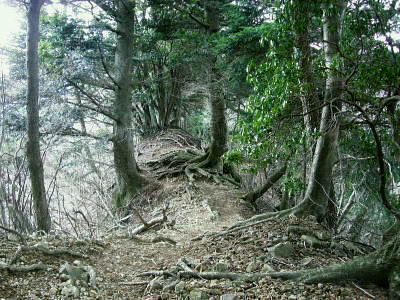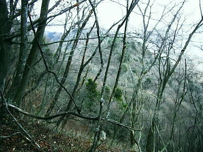 丹沢には「三峰」が2つある。一つは主峰の丹沢山から宮ケ瀬を結ぶコース上の山々で「丹沢三峰」と呼ばれている。 一方.大山から唐沢峠を経て北東に延びる稜線上に続くもう1つの小さな三峰は「大山三峰」と呼ばれていた。 標高は低いが桟橋や鎖場が連続し峻険な山で昔の修行道だった。 この先ルート上には石祠・石碑を目にするが.これは八菅神社から半原越・土山峠・辺室山・大山三山・唐沢峠を経て大山雨降神社に登拝した。 過っての「信仰の道」その古道の名残でもある。 下りは古くからの作業道.惣久径路を下ろうと思っている。 三峰北峰北側よりの鳥屋持沢と不動沢を挟む尾根, 616m峰と415m峰を越え谷太郎林道へ。 浅い踏み跡を探り尾根を下る。気が湧き立つが取付きに近ずくも.尾根元の取付きが藪で分かりずらかった。 大山北尾根から唐沢右岸の主尾根を北上 唐沢峠で昼食後.尾根沿いに大山三峰山に立つ―不動沢左岸尾根(八丁経路)を経て谷太郎林道から煤ヶ谷 難路とされている幅広くなった三峰山手前の尾根を抜ける.12:39再び破線の径 唐沢の頭を越えると不動尻への分岐となり.北上する尾根は破線路になっている。確りした幅広い尾根.崩れる足場はない。 ただ急に広がりだした尾根筋は疎林で見晴らしがよく.却ってコースを間違え易い場所だった。 私も唐沢川側に寄りすぎ一時踏み跡径を失った。戻りこれが破線路になっていると思った。ただ静かな山旅を味わえる尾根。 不動尻の分岐.手前の腕木「煤ヶ谷5.0km.物見峠23km」とある先の登山道にでて再び不動尻の分岐にでる。一般登山道となったその先は迷うことはないが踏み跡は悪かった。 三峰山付近は脆い礫石の侵食を受け.ガレた痩せ尾根で頂前後に鎖場(施設管理標あり)がある。思いもせぬ険しい岩場がある。 やはり昔の修行の場だった。再び起伏の激しい鎖場を下り.笹藪で囲まれた緩やかな歩き易い尾根径を歩む。そして2っ目の道標を見付けている。 三峰山への登り.13:26最初の鎖場.丸太桟脇に花束が一束添えられていた。理由は想像できるも無言で通過している。 後日.昨年滑落事故があったと知る。改めて鎖.手すり.チェン等が新規に増設設置されていた。険しく息切れした登りの後.三峰山にでている。 惣久径路がある鳥屋待沢左岸尾根,13:35大山三峰で舞う雪粒 杉ノ沢の頭を越えた頂は視界は樹林で閉ざされていた。山頂標柱より道標の方が大きく数もある山頂だった。 標柱の傍にあるのが三等三角点の頭.右側が欠けた標石があり.標高は934.6m.基準点は「三峰」. 細長い小さな頂には野外卓がもあり1本取っている。最後の頂に立つも.とうとう陽射しは差さなかった。 重い雲が立ち込める雨雲に中にいた。よく見ると小さな白い粒が舞いだし.氷の結晶を見ている。 今年は全国的に積雪量がまだ少なく.東北地方などでは雪合戦.吹雪ツァー等.雪に関する行事が雪不足で中止になっていた。 大山周辺は1月中は積雪に恵まれたが全て溶けてしまっている。頂でお会いした人の話によると1/10.三峰山〜大山は積雪あり ヤビツ峠からのバスは凍結で不通に.1/14雪残る。1/25,三峰山に積雪あり。 丁度頂に立った時.昨年一緒に雲取山に登った幼馴染長塩から電話が入る。今雲取山にいるが一昨日に続き.今日も本降りの雨だと。 積雪は小雲取山から上でしか認められなかとも。ここ三峰山では気持ちだけの雪粒が舞い始めていた。 昨年は同じ時期.「雪が降ったぞ!」と合言葉のように.鴨沢から雪面を踏み締め友と雲取山に登っていた。 三峰山の下り.14:10道標の裏側は幅広くロープで閉ざされている踏み跡があるも惣久経路として確認はできずにいた。下調べではっきりせず弱腰過ぎていた。 悠著し歩みを止め.何度も考えるも堂々巡りして確信が持てず。入径は諦めざるえなかった。 更に物見峠方面に下った北側の尾根で八丁径路を見いだしている。それで先程の場所が改めて惣久径路であったと確信した。 不動沢左岸尾根(八丁経路) この先の頂稜の尾根径も長閑な歩き易い散策路になっている。静かな尾根径で落葉の蹴る音色がよく聞こえている。 物見峠の手前で再び道標裏側に踏み跡を見付け.縦走路を分け右に折れ八丁径路を下ることにした。 北峰取付き口.道標から10分程下った所で.道標(←三峰山,煤ヶ谷→)に小さく黒のマジックで八丁経路と付け加えられていた。 1本取り偵察する。ススタケ藪を潜ると確りした踏み跡が続き.地図を見ても下れる尾根だった。 赤いテープを見付け無意識に手袋をはめている。不動沢左岸尾根の下降を決める。踏み跡を失い迷っても日没前に下りられるだろう。 八丁経路から頂稜を振り返る.14:39不動沢左岸尾根 巨木と傾斜が落ち始めた尾根を下る.14:39以外と強い傾斜が初めから続いていた。踏み跡はネクタイ尾根より浅く長い。右に不動沢.左側には水ノ尻沢を確認して一歩一歩下る。 中端で樅の巨樹に出偶した。探すと2本.3本と所々尾根上に乱立していた。 目印は忘れる頃に白いテープが小枝に掛かり.又落ちていた。